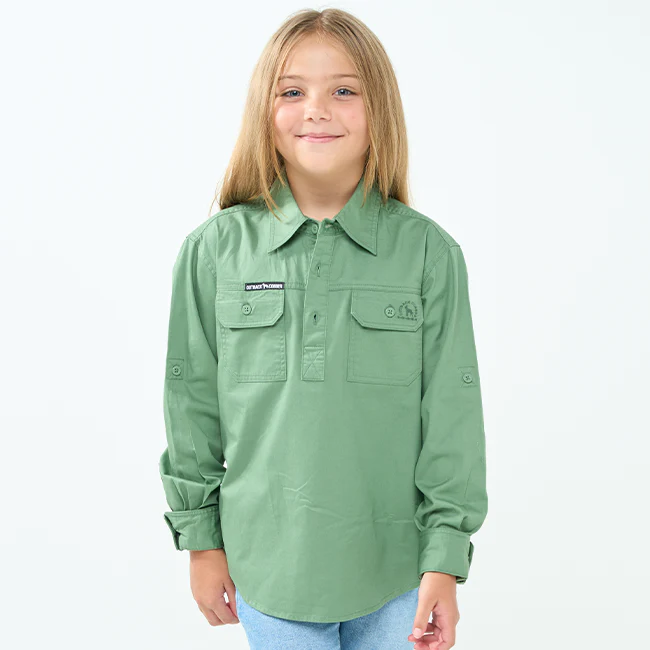HAZELDEAN|Kids Half Button Long Sleeve Work Shirt | Gum Leaf Green